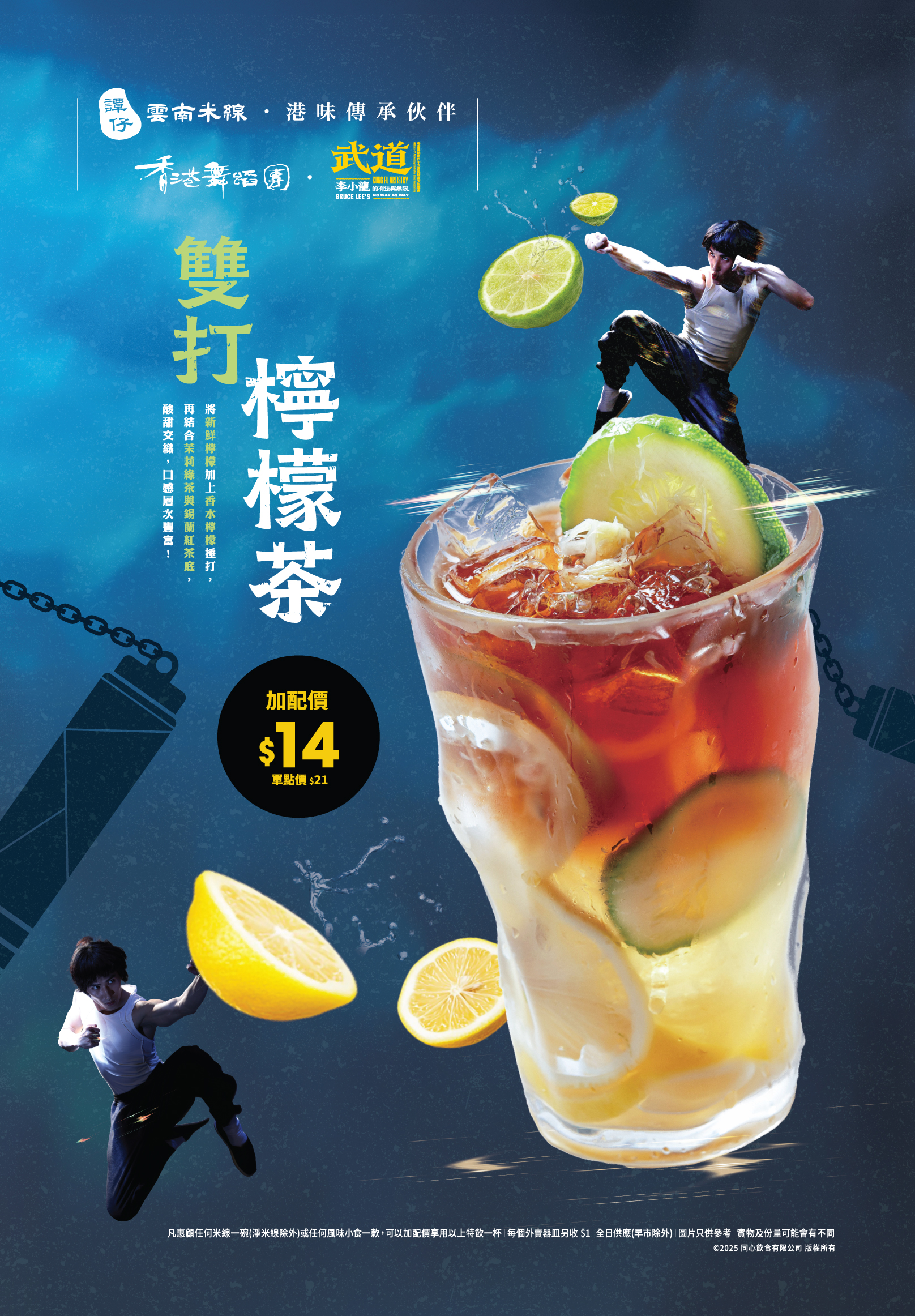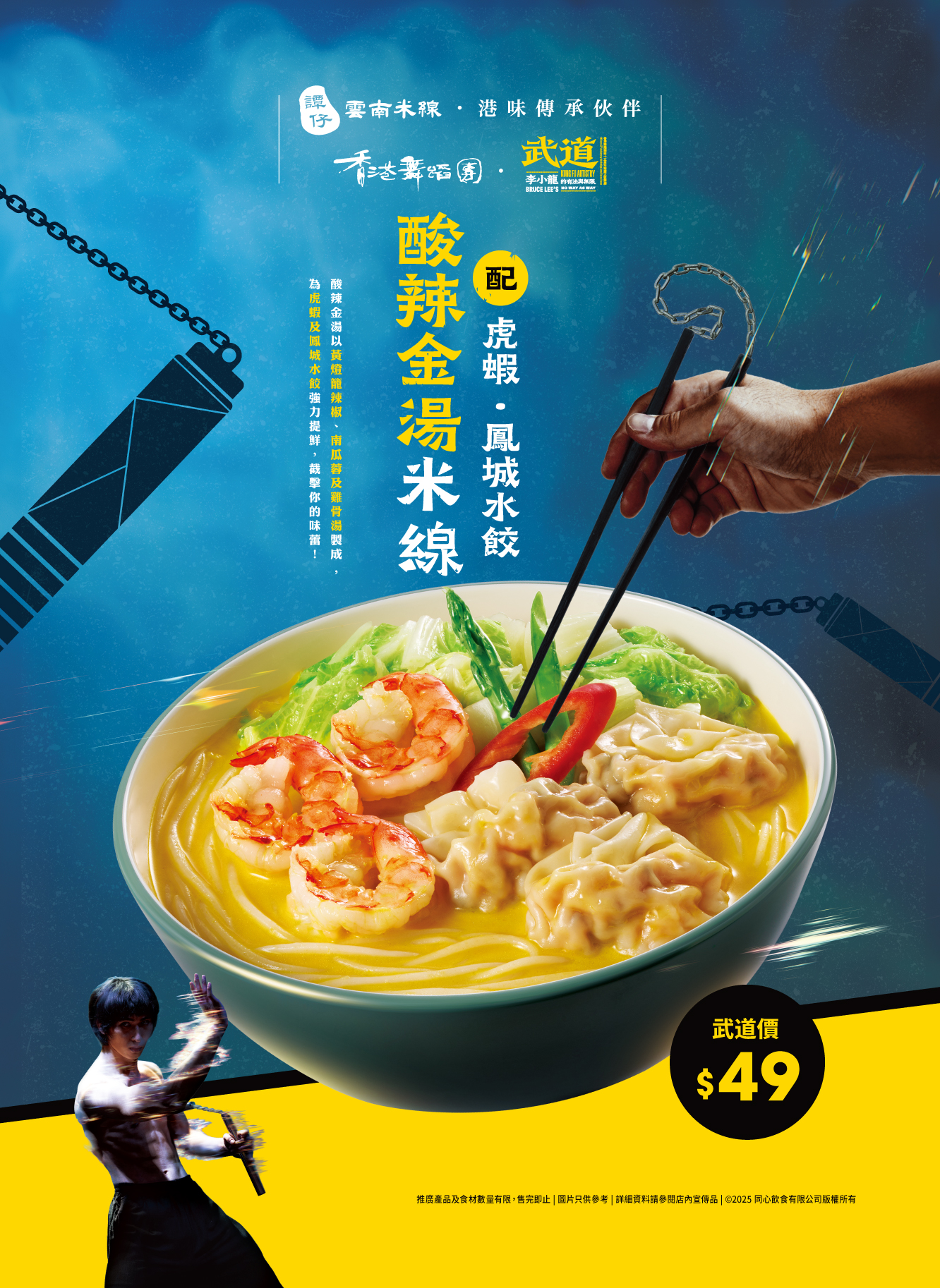 武道,化繁复为简璞;味道,从百炼成极致。对李小龙而言,真功夫并非追求花俏或炫技,而是用最少的动作和力气达致决胜,香港舞蹈团再度伙拍谭仔云南米线为「港味传承伙伴」,于10月21日起推出全新「谭仔 ╳ 舞剧《武道》」联乘企划,除了将多间分店改装成舞剧《武道》限定主题店,并特意推出一系列期间限定全新酸辣金汤米线、创意小食与双打柠檬茶特饮,截击众人味蕾,透过研发新口味向经典精神致敬,及跨界协作推广香港特色!